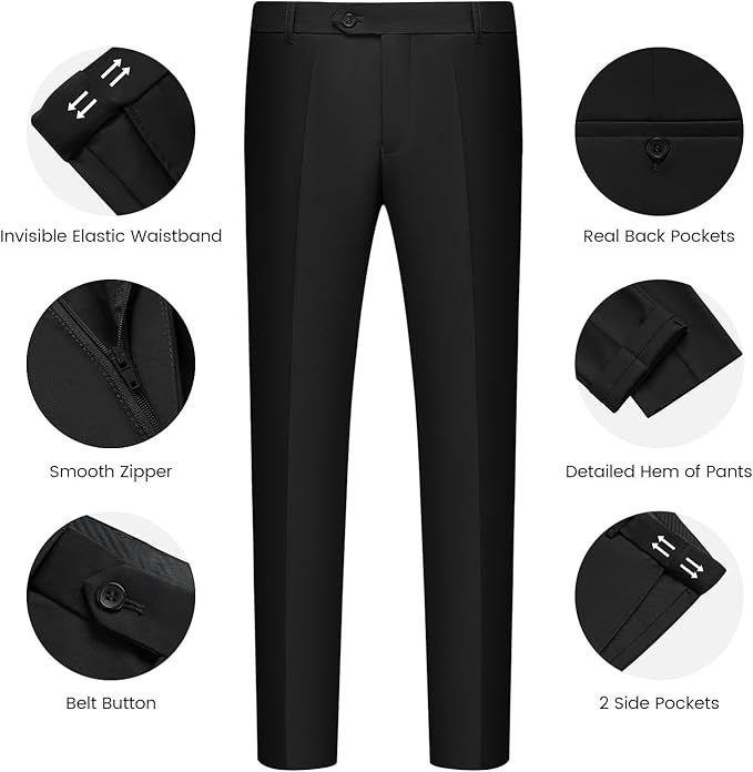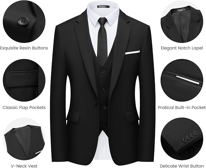 - Este traje de esmoquin con diseño de hombro completo y corte delgado con drapeado 3D. El corte ajustado se adapta un poco más apretado que un traje de ajuste regular. Cuando lo pones te hace más delgada y afilada. Y se ve moderno y guapo